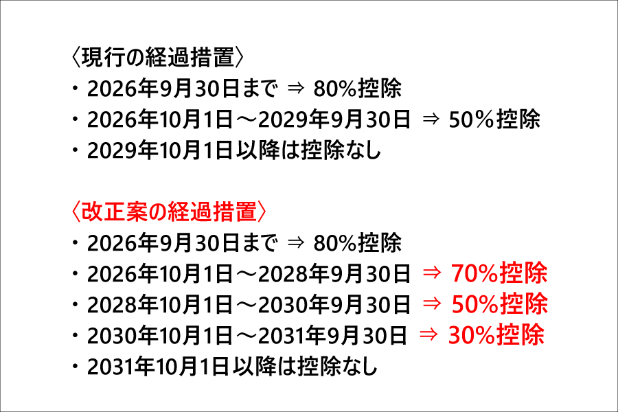 中 それが、今回の改正案では、経過措置の期間が2年延長されたうえ、その段階的な控除可能割合の引き下げについても、より緩やかな方向に見直されたんですよ。わかりやすく箇条書きにしてみました。